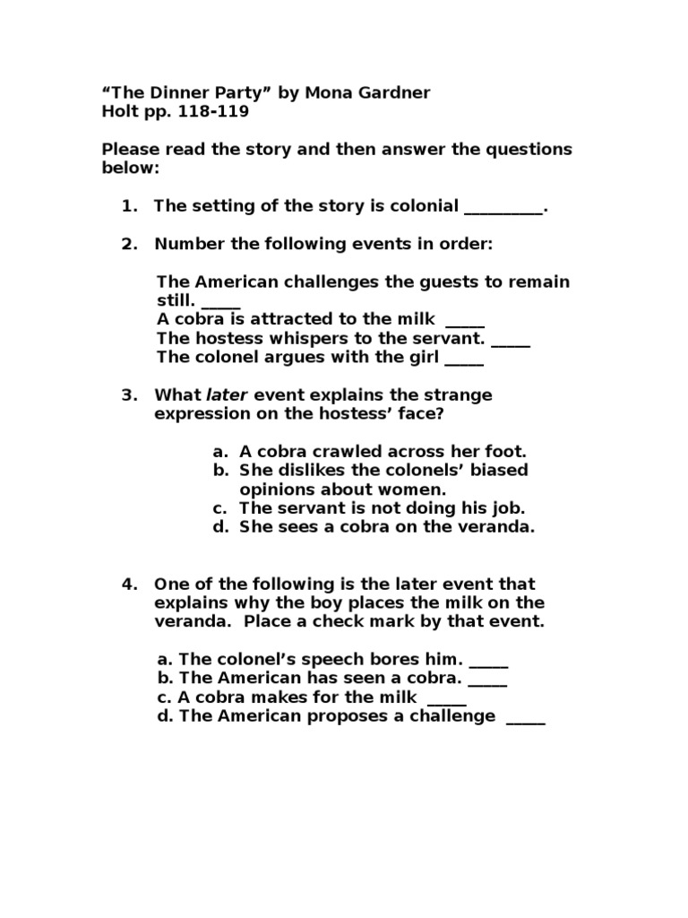 The dinner party by mona gardner questions. Check spelling or type a new query. Maybe you would like to learn more about one of these? We did not find results for: